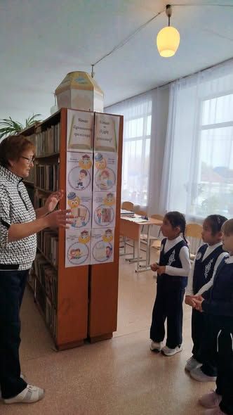 Балалар кітапханамен танысып, мұнда әртүрлі кітаптар «тұратын» ерекше орын екенін білді. Кітапханашы кітаптардың үйге берілу тәртібімен таныстырып, әр оқушының кітапхана оқырманы бола алатынын түсіндірді.
